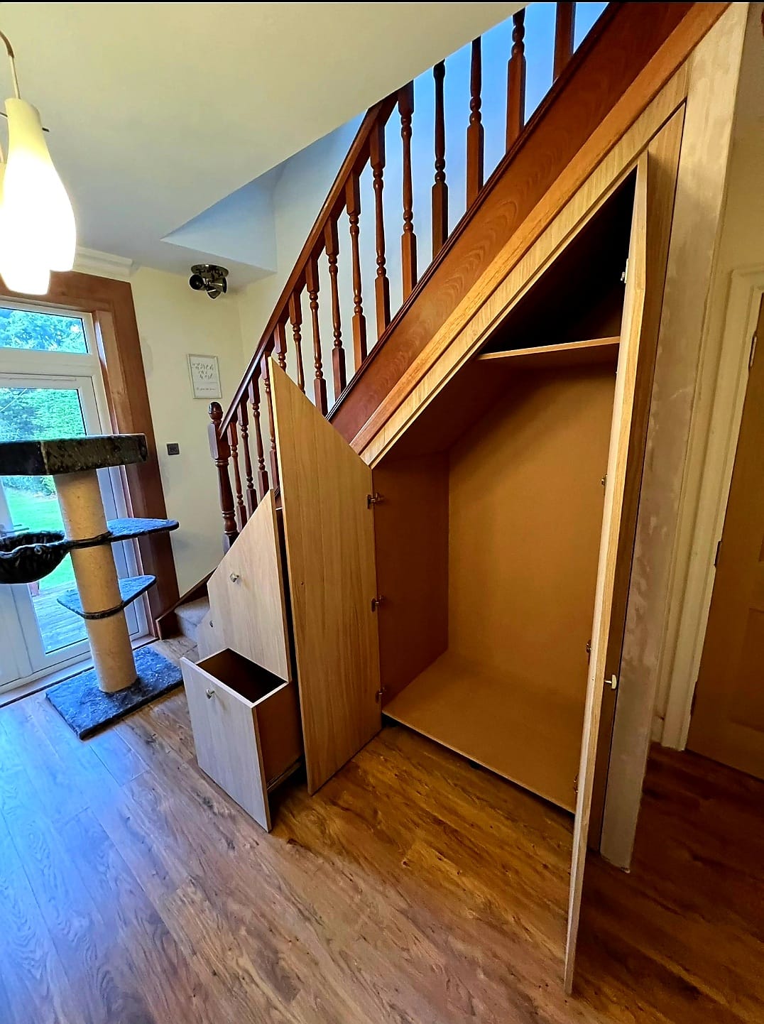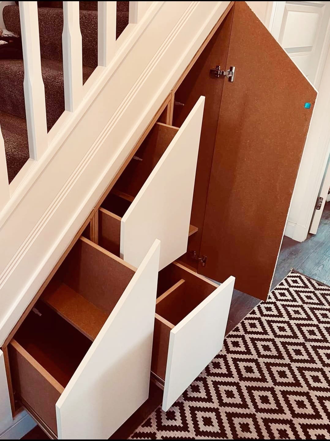 Our understairs drawers are bespoke made for every customer - with push to open and soft close doors. Each drawer is fitted with heavy duty runners to last for years and it holds up to 80kg. Fronts also can be custom made - in white finish, mirrored, with mouldings or in beautiful oak finish.